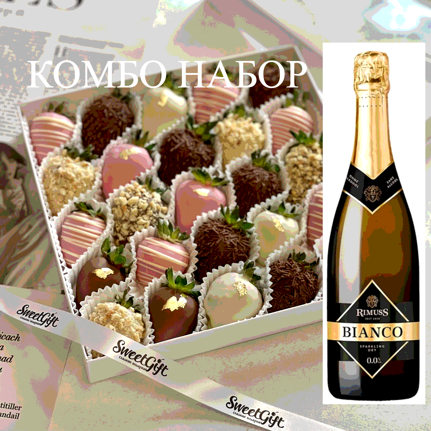 Специальное предложение: при заказе комплекта “Клубника с шампанским(безалкогольным!)” – бесплатная доставка и стильная подарочная коробка в подарок! 🎁