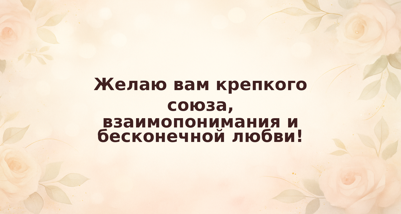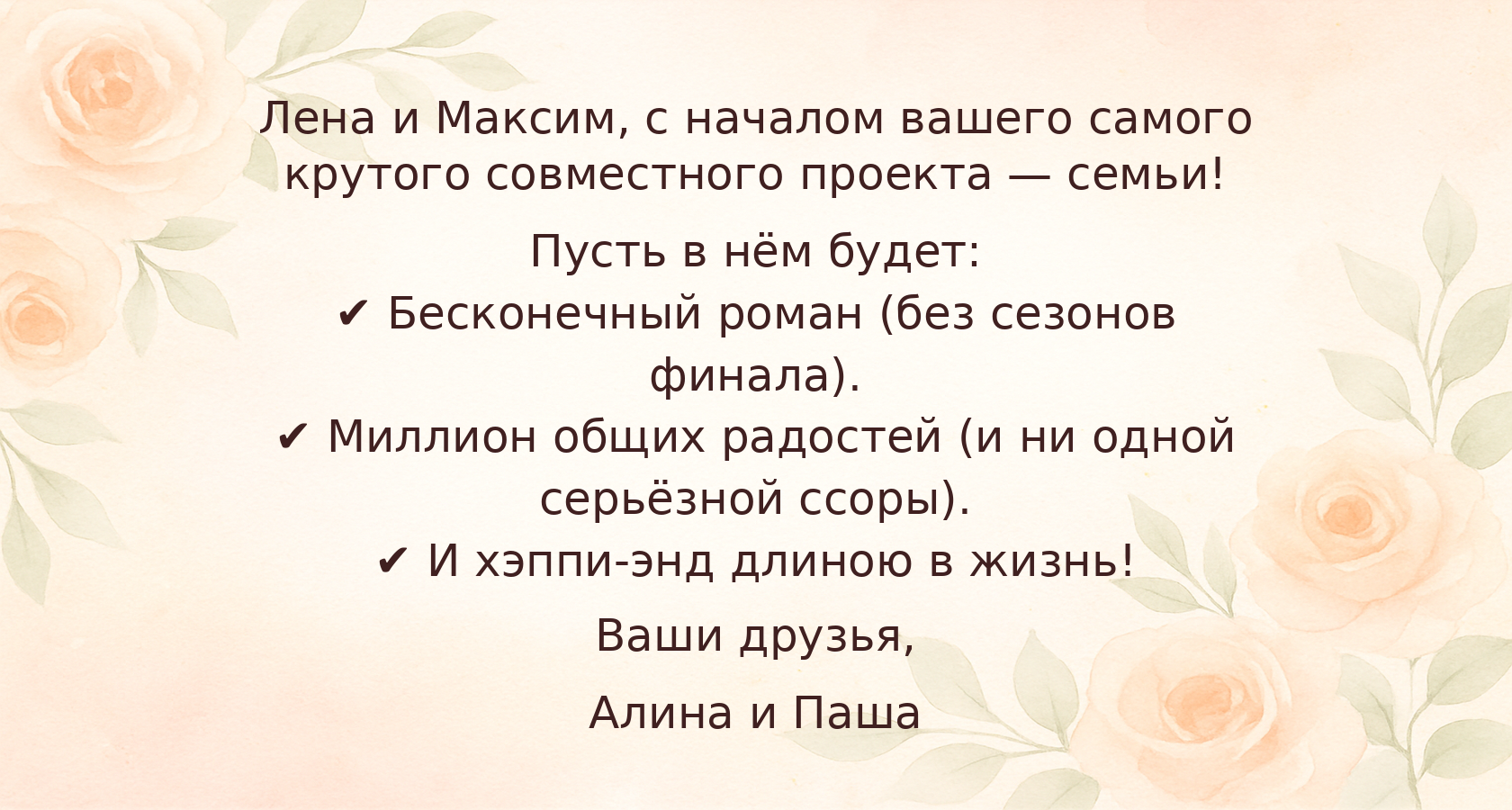 Сегодня начинается ваша самая важная глава жизни — семейная. Я так рада, что вы нашли друг друга! Пусть ваши сердца всегда остаются такими же нежными, а совместные годы приносят только счастье. Мечтайте, путешествуйте, смейтесь вместе — и знайте, что мы всегда рядом!