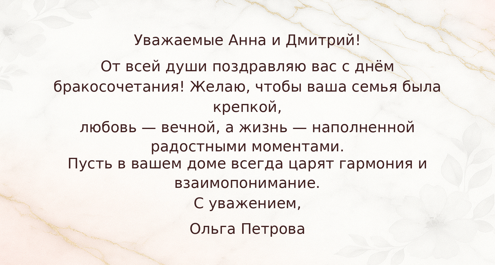 От всей души поздравляю вас с днём бракосочетания! Желаю, чтобы ваша семья была крепкой, любовь — вечной, а жизнь — наполненной радостными моментами. Пусть в вашем доме всегда царят гармония и взаимопонимание.